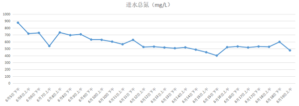 由調試數據記錄可知,采用庫巴魯“總氮菌種+復合碳源”的方式對生化系統(tǒng)總氮的去除率有明顯的提升效果,在馴化成功后,總氮呈下降趨勢,降幅較大,從280mg/L降低到40mg/L 以下,接著總氮開始呈現達標狀態(tài),效果顯著。同時對碳源流量、污泥濃度、曝氣程度進行調整后,第二天出水總氮下降至標準40mg/L以下,COD不超標。并可持續(xù)穩(wěn)定達到排放標準。后續(xù)補加菌種,出水總氮一直處于穩(wěn)定達標狀態(tài),說明微生物的種群結構得到改善,提升了缺氧系統(tǒng)的反硝化能力。