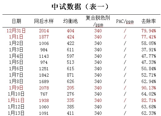 本次中試,按照紙廠原操作流程展開,在中試階段,考慮現場水質較小試水質有變化和現場設施的局限性,無法滿足最佳藥量時所的需設施要求和工藝環境,通過與現場張工溝通,決定先采取比較保守的投藥方式進行投加新型聚合硫酸鐵。每天對網后水和均衡水池的廢水分析CODcr數據表一。