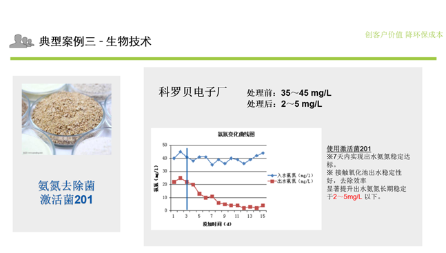 我司最新的氨氮降解技術是采用我司自主培養的氨氮降解菌來解決污水生化上的氨氮超標的問題。