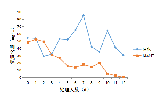 在接觸氧化池加入菌種3天后,出水氨氮顯著下降,10日后穩(wěn)定低于8mg/L