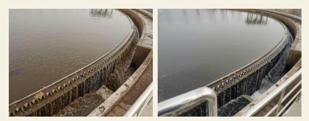 在此種條件下,在生化池末端原位應(yīng)急投加可生物降解的生物靶向助沉劑,可以提高泥水分離效果,二沉池污泥高度維持在可控范圍,出水清澈不帶泥,保障生化池正常運行。與投加PAC、聚合硫酸鐵、聚丙烯酰胺相比,具有投加量少、費用低廉安全無毒、效果迅速、無依賴性等特點。