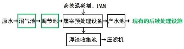 1.鑒于進水COD濃度高于1000mg/L,且SS濃度高和氨氮波動大等的特征,需要先采取物化預處理,降低水中COD、SS和動植物油的含量。因此,增加了一臺高效屠宰廢水預處理設備,預處理后的產水再經格柵流入生化工藝段,降低生化工藝段的處理負荷。