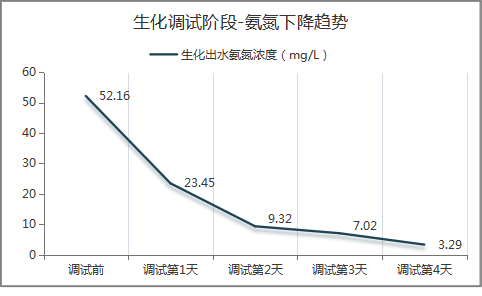 通過投加優勢菌種,達到快速啟動和提升系統處理能力的目的。菌劑投加三日后整個生化系統處理能力大幅度提升,COD、氨氮的去除率顯著提升,生化系統抗沖擊能力增強。生化處理對COD去除率可達到85%-95%,氨氮去除率95%以上。