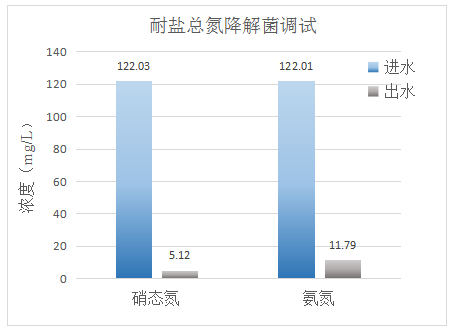 糧果廢水鹽度2%,30℃下經過我司耐鹽總氮降解菌的生物調試后,硝態氮的去除率超過95%、氨氮的去除率超過90%。